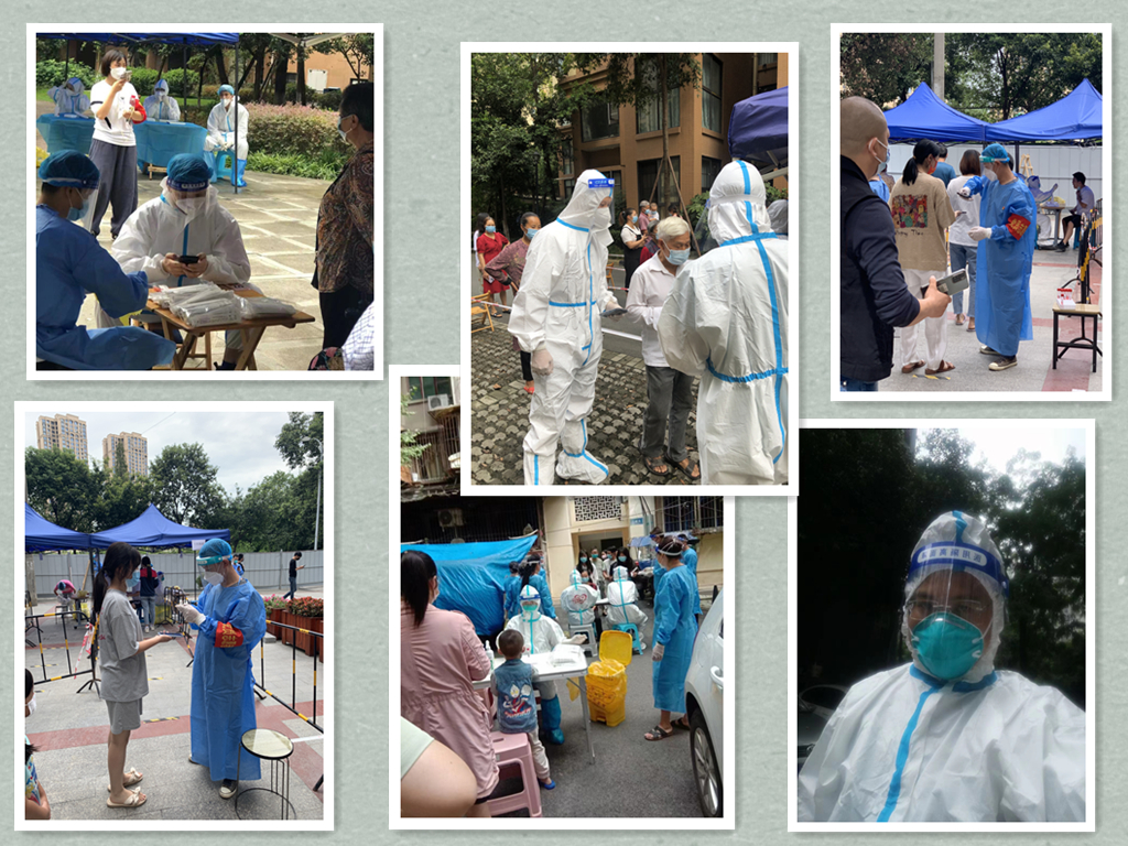 “各司其職、定格堅(jiān)守”“請(qǐng)有序排隊(duì)、老年人請(qǐng)這邊先做”“大爺、大媽,我來(lái)幫您掃碼”“來(lái)小朋友,嘴巴張大,??!”“大白”“小藍(lán)”志愿者們各司其職,引導(dǎo)著居民們排隊(duì)掃碼核酸采樣,醫(yī)護(hù)人員們也有條不紊地為居民進(jìn)行核酸采樣。“一管管采樣試劑、一滴滴艱辛汗水、一條條臉龐勒痕”他們沒(méi)有喊苦喊累,依然用心用情地為居民們服務(wù)。