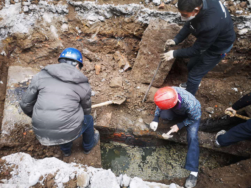 2020年2月18日晨,公司接連接到中江縣城西路用戶反映家中停水,同時繼光水廠值班室也發(fā)現(xiàn)城西片區(qū)壓力比平時略有降低。公司黨支部書記、總經(jīng)理朱禹接到匯報后立即詢問應(yīng)急值班維修人員有無應(yīng)急維修停水搶修點(diǎn)位,當(dāng)?shù)玫娇隙ǖ拇饛?fù)后,立即組織相關(guān)人員進(jìn)行分析研判,基本確定城西片區(qū)管網(wǎng)發(fā)生爆管。隨即安排工程搶險隊(duì)人員做好個人防護(hù),第一時間兵分兩路對這片區(qū)近一公里的管網(wǎng)進(jìn)行分段排查。不到一小時,排查人員即發(fā)現(xiàn)城西路金林物資公司外街道下面DN150水泥管爆裂致使該片區(qū)用戶停水。