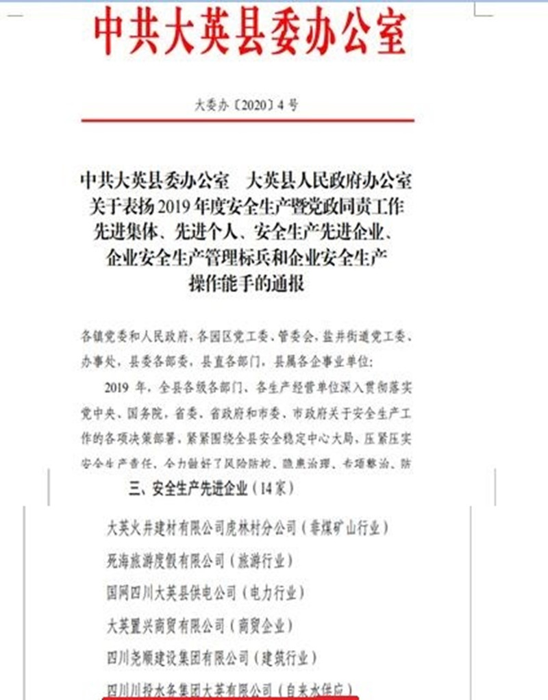 在大英縣2019年度安全生產(chǎn)暨黨政同責(zé)工作中,大英水司獲得大英縣“安全生產(chǎn)先進(jìn)企業(yè)”榮譽(yù)。