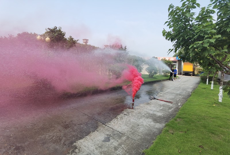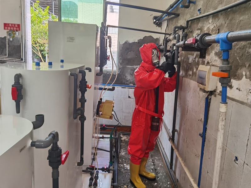 搶險(xiǎn)人員分為兩組同時(shí)進(jìn)行搶險(xiǎn),第一組搶險(xiǎn)人員穿好耐酸堿防護(hù)服,戴好防毒面具,進(jìn)入加藥車間切斷二氧化氯機(jī)電源,打開通風(fēng)設(shè)備和尋找泄漏點(diǎn);第二組搶險(xiǎn)人員為防止二氧化氯氣體大面積擴(kuò)散,站在上風(fēng)口利用高壓水槍對(duì)泄露的二氧化氯氣體進(jìn)行稀釋,并準(zhǔn)備好干粉滅火器防止設(shè)備因線路故障導(dǎo)致自燃。整個(gè)演練過程嚴(yán)謹(jǐn)、有序,各應(yīng)急隊(duì)伍協(xié)調(diào)配合,有條不紊。