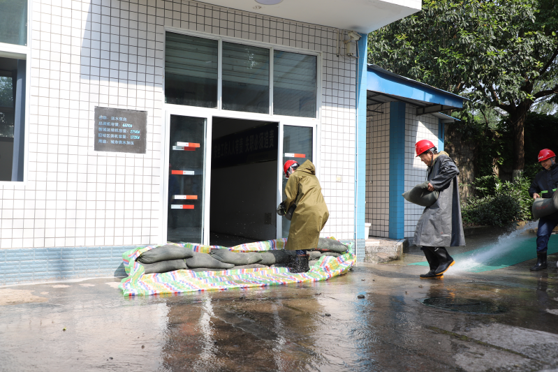 防洪防汛防澇應(yīng)急演練,模擬在天氣突然強(qiáng)降雨的情況下,值班人員發(fā)現(xiàn)險(xiǎn)情向部門負(fù)責(zé)人報(bào)告,部門負(fù)責(zé)人接到險(xiǎn)情報(bào)告并請(qǐng)示龔總后,按照演練方案立即啟動(dòng)防洪、防汛、防澇應(yīng)急預(yù)案。參演人員迅速采取應(yīng)急措施,用擋水板、沙袋進(jìn)行防護(hù),阻擋洪水進(jìn)入泵房,泵房?jī)?nèi)有積水時(shí)迅速用排水泵將積水排出泵房外,同時(shí)水質(zhì)化驗(yàn)人員對(duì)水質(zhì)進(jìn)行檢測(cè),水質(zhì)檢測(cè)后演練結(jié)束。
